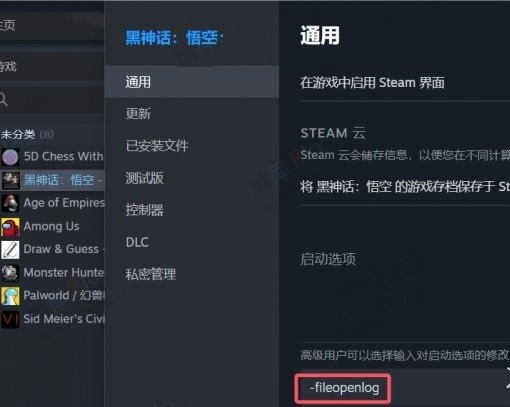 3、将命令-fileopenlog添加到steam的启动命令中。(参考预览图,已执行过可跳过本步骤)