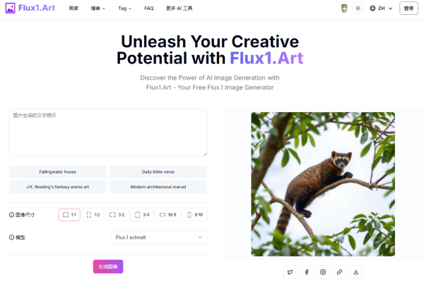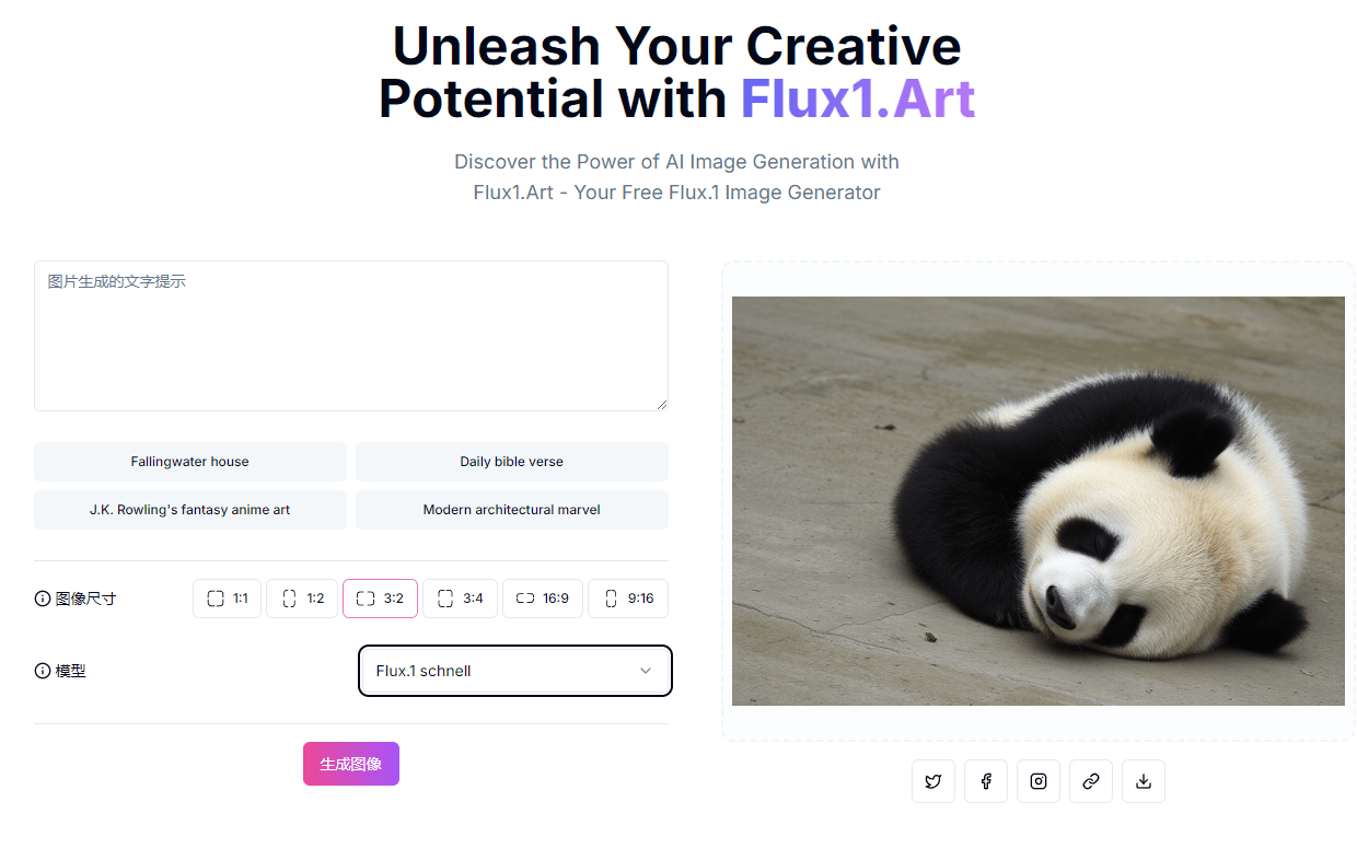 AI 文生图工具,使用 Flux.1 模型,输入文字描述,几秒即可生成图像,可选择图片比例,免费使用,无次数限制,无需注册,但是有登录入口,说不定就收费,且用且珍惜,速度还是可以的