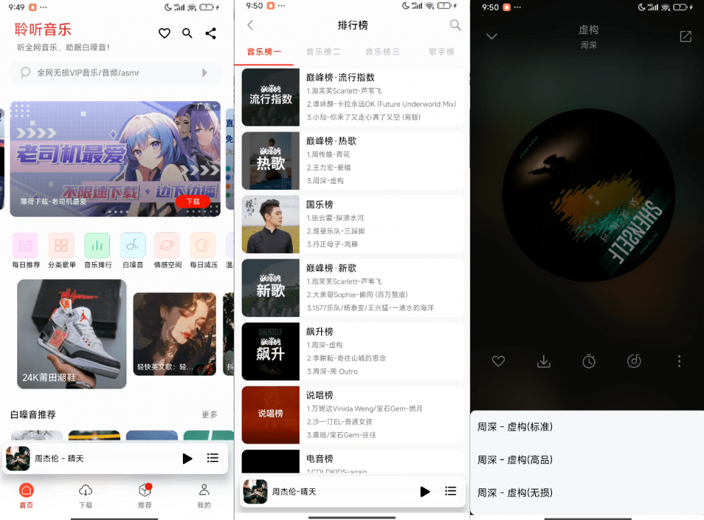 - 各种排行榜,以及多平台下载,支持多音质选择下载