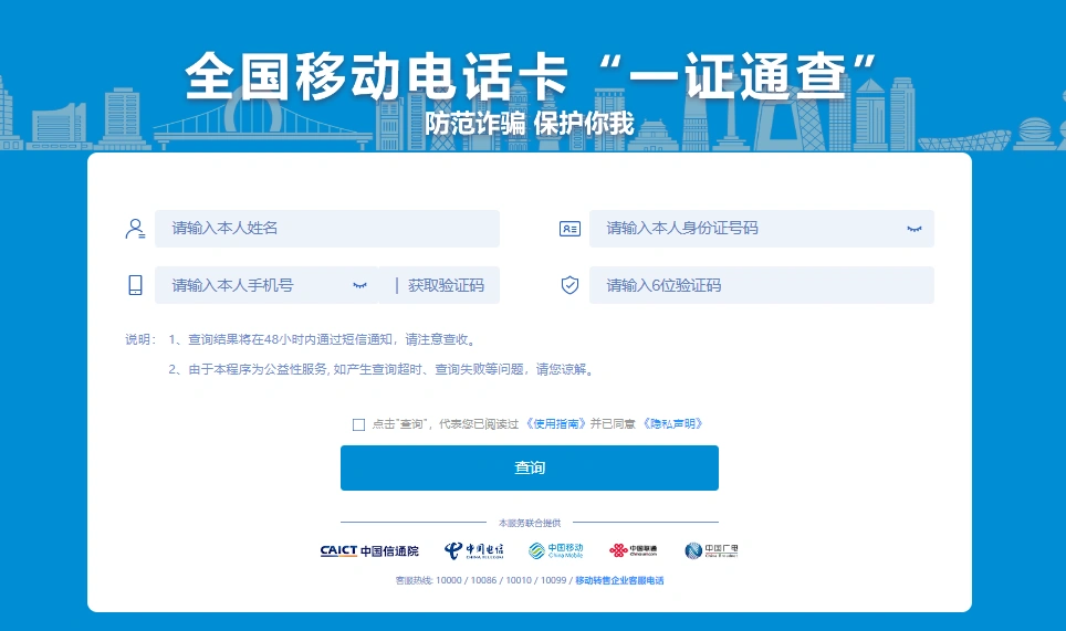 全国移动电话卡“一证通查”是由工信部指导,工信部反诈中心(中国信通院)、中国电信、中国移动、中国联通及移动通信转售企业共同推出的公益性查询服务,可以为用户提供本人在各个运营商通过居民身份证办理的所有处于在网状态的移动电话卡数量。