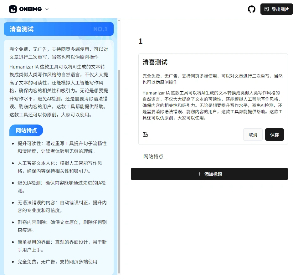 一个纯前端实现的文字转图片应用,您可以通过编辑器输入文本和图片,使用预设的 CSS 模板样式,快速生成预览,并导出为图片。适合微信公众号长图推文以及小红书、Instagram 等图片社交媒体贴文制作。