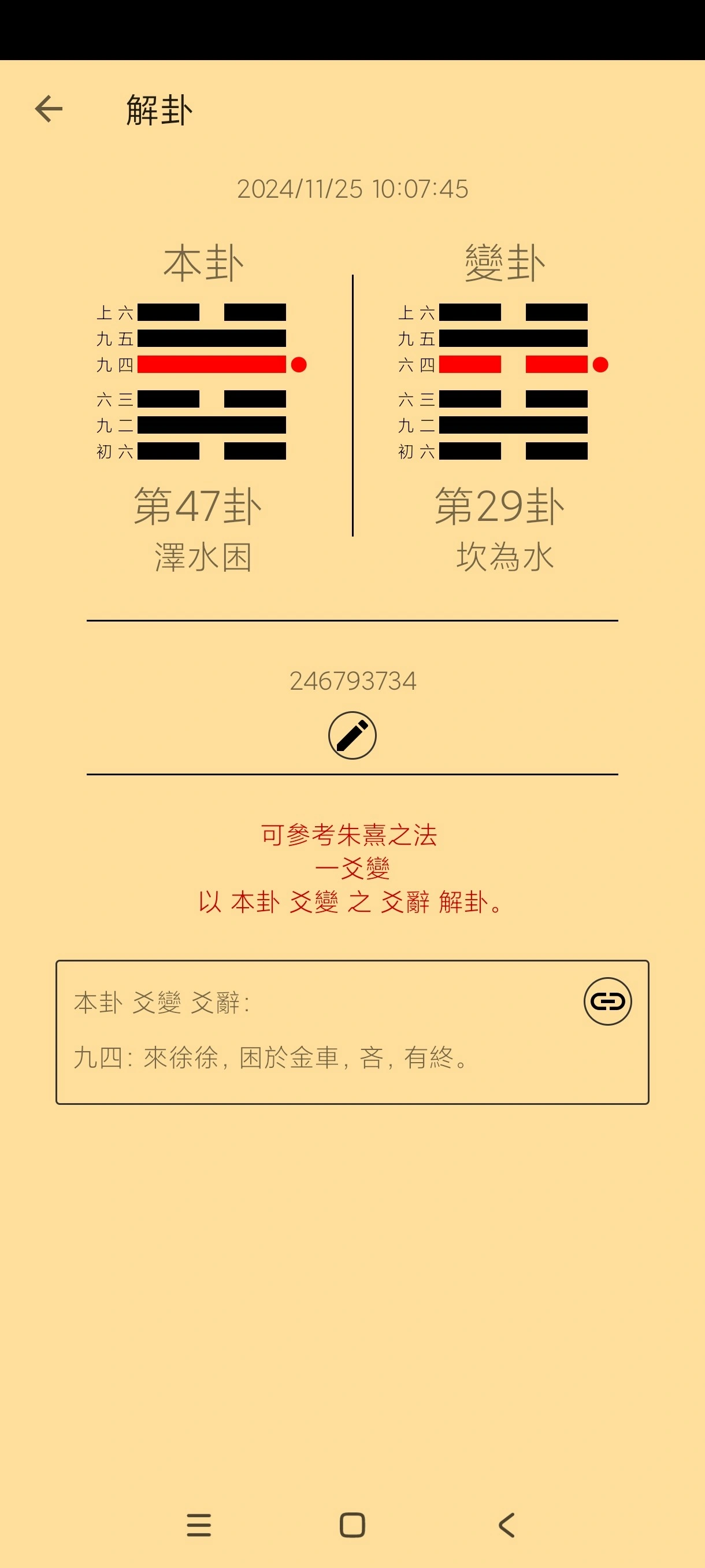 【软件介绍】易經錢卦占卜是一款非常有趣的占卜软件。使用易经占卜工具APP,就能让你学会占卜的技术,帮助你更好的利用占卜,在首页点击开始占卜(由下至上,阴爻为0,阳爻为1,查找相应的卦辞(相应的卦象背景图),趣味占卜法(仅供娱乐):将三枚钱币合扣在手心,意念集中在所测之事上,随意摇动几下,然后双手分开,将钱散落在平整、干净、较硬的物体平面上,让钱币自行滚动。