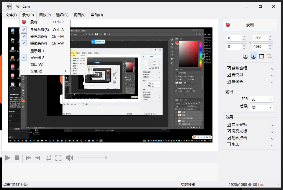 - 软件录屏功能强大,添加鼠标轨迹、鼠标点击动作、麦克风、电脑屏幕、摄像头均可以录制