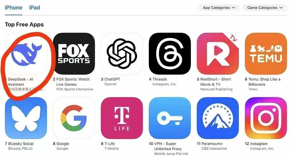 国内大模型公司深度求索”开发的Deepseek应用推出的DeepSeek-V3在全球AI领域”杀疯了”,压ChatGPT,登顶美区App Store免费榜,同时在国内App Store免费榜也位居第一,移动应用下载量超过ChatGPT的3倍。仅以560万元研发成本,打败了国人工智能研究中心、谷歌等美国科技巨头投入数亿玩乃至数十亿美元研发的AI技术,展现了中国AI技术的动,令人骄傲!国产牛逼!