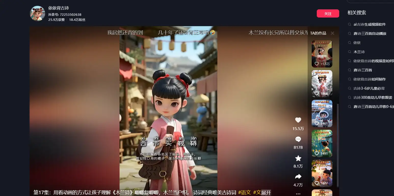 1. 平台赚钱 :通过在各大视频平台(如抖音、快手、B 站等)发布高质量的 AI 古诗词视频,吸引大量粉丝关注,从而获得平台的流量收益和奖励。