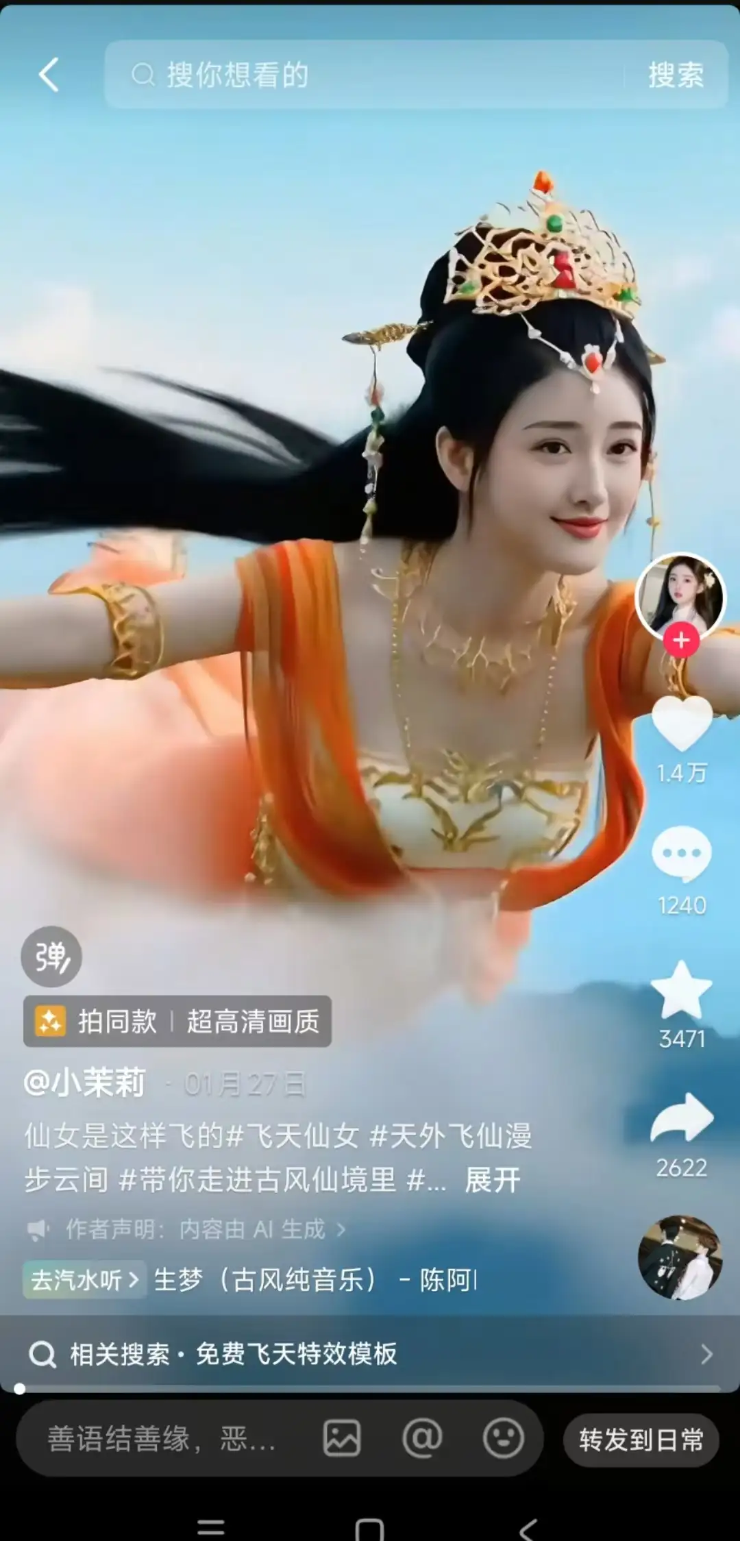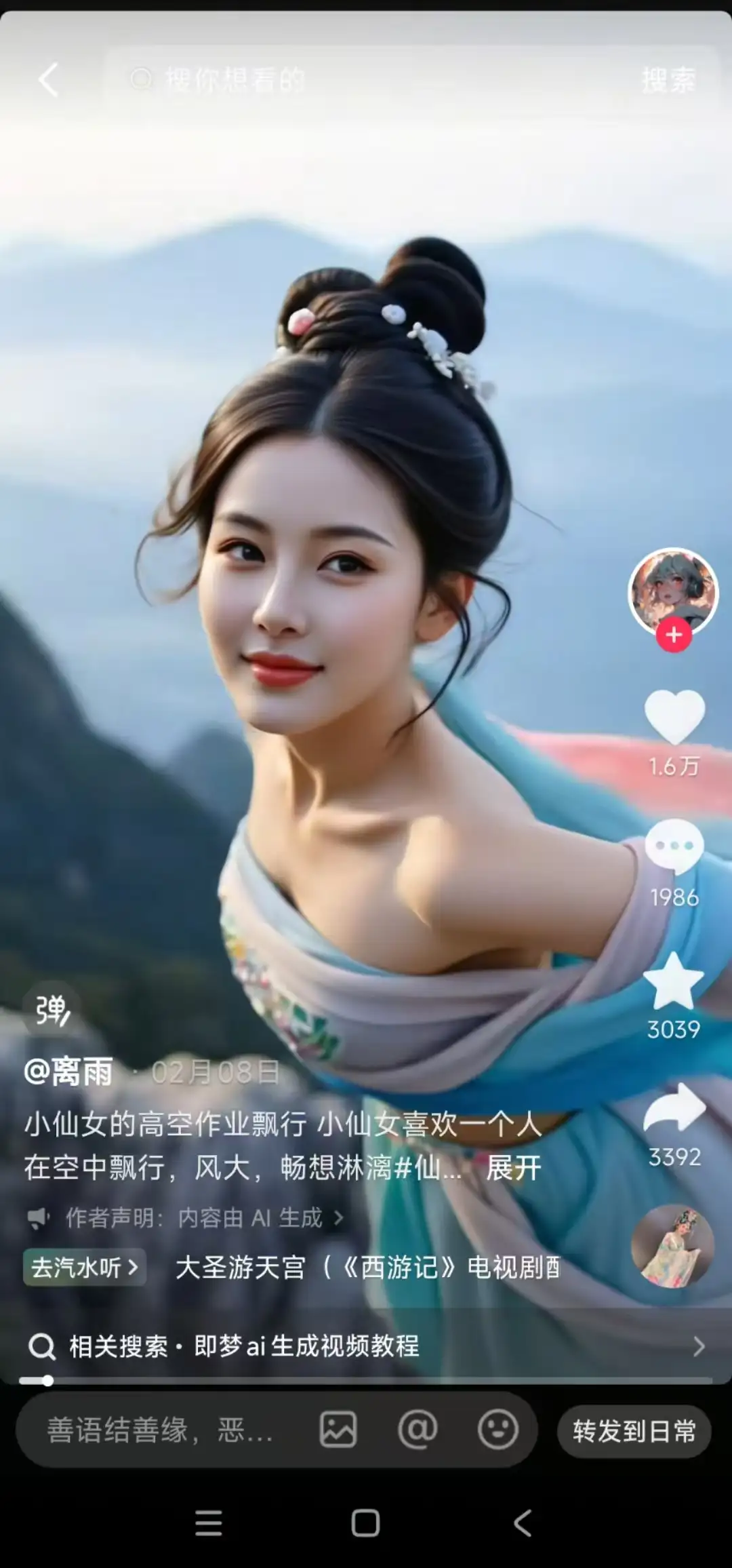 - 创意新颖:AI技术让视频内容更加丰富多样,飞天效果、特效背景等元素让视频更具吸引力。