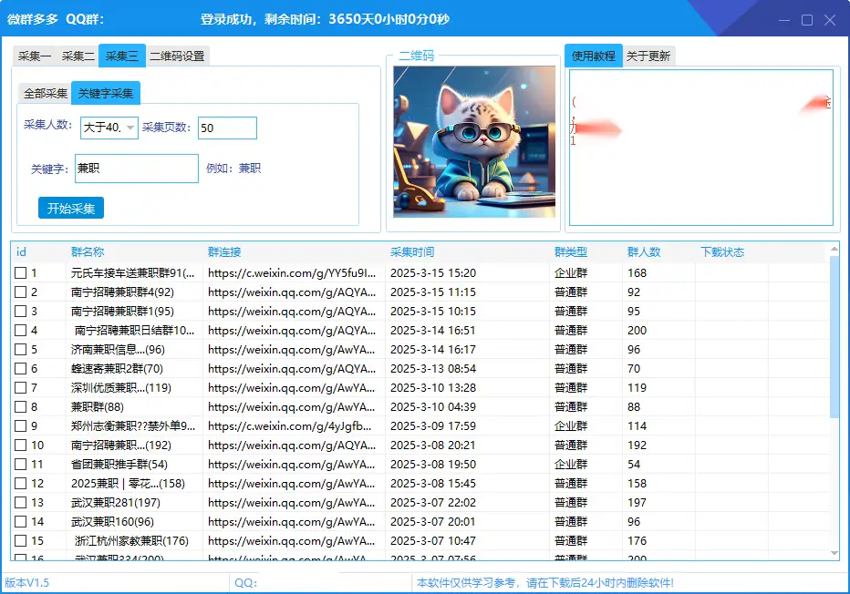 微信群多多采集器的操作非常简单,即使是零基础的用户也能轻松上手。它提供了直观的界面和详细的使用说明,帮助你快速掌握采集技巧,提高工作效率。