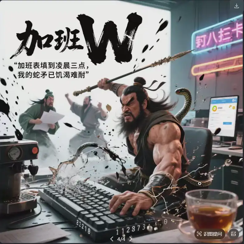 输入提示词:“曹操 项目经理 深夜加班 电脑屏幕闪烁 满地文件”,生成带夸张表情的职场化三国人物图。 - Step2:文案搭配