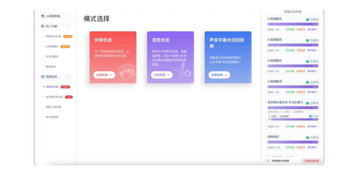 - 30 + 智能处理方案:涵盖横竖屏转换、智能去重、画质增强等场景,GPU 加速确保 4K 视频实时渲染