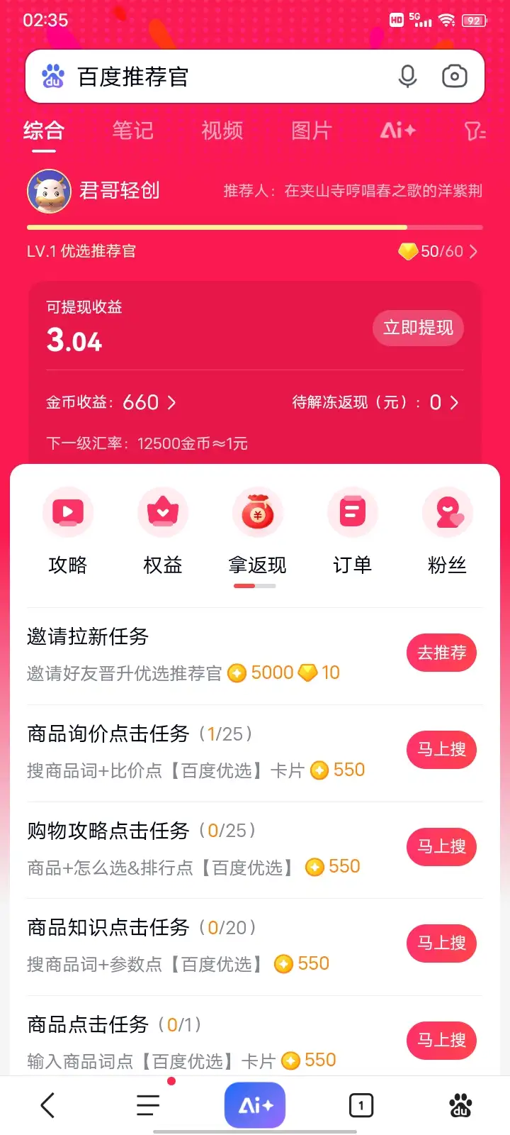 • 百度优选推荐官是百度官方推出的​​智能购物决策平台兼零门槛副业项目​​,用户通过完成平台任务获取金币并兑换现金。其核心是为百度生态引流(如商品搜索、广告曝光),同时让用户通过碎片化操作赚取收益,形成双向价值闭环。