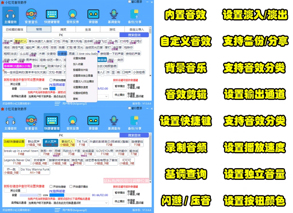 - 内置上千款常用音效,包括抖音,流行歌曲高潮部分,保持更新,任您选择! 是各大平台主播活跃气氛的必备软件助手