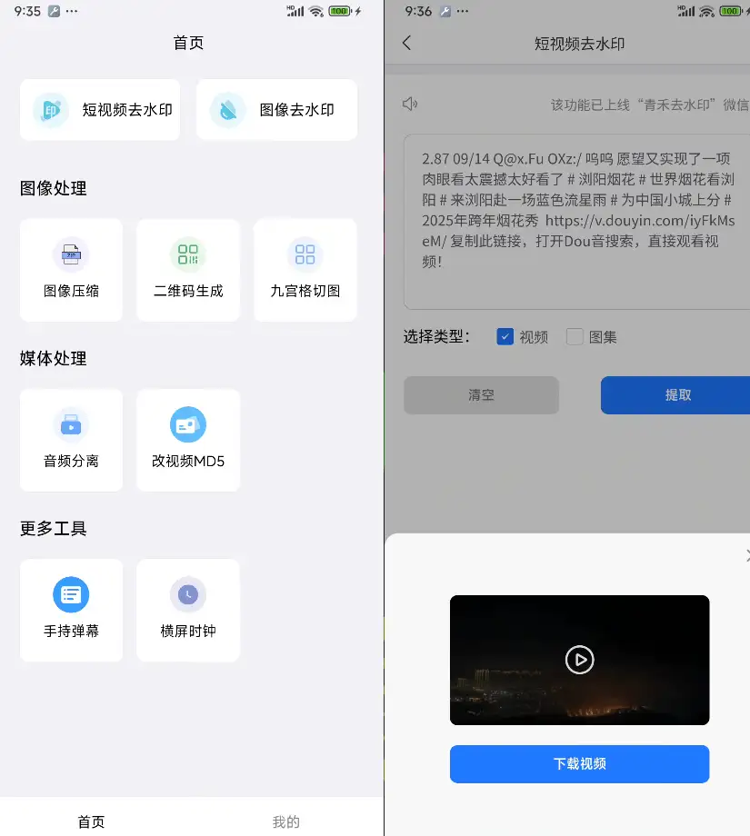 - 获取原始视频和图片。软件的功能远不止去水印一项,还有它图像去水印、图像压缩、二维码生成、九宫格切图、音视频分离等日常可能用到的音视频、图像处理功能。