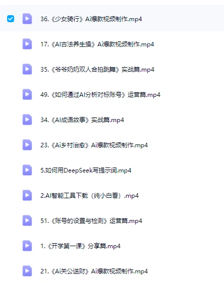 • 课程分为5大模块:基础工具(Deepseek/豆包/去水印)、爆款视频制作(古风/萌宠/生活类)