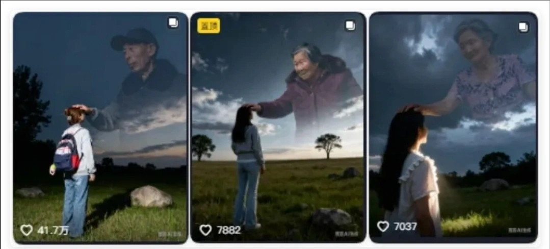 - 用AI修复老照片,让老照片动起来,半透明人托梦等AI制作来寄托思念。最近一组 AI 合成的去世亲人摸头照片在抖音获得 41.7万点赞。