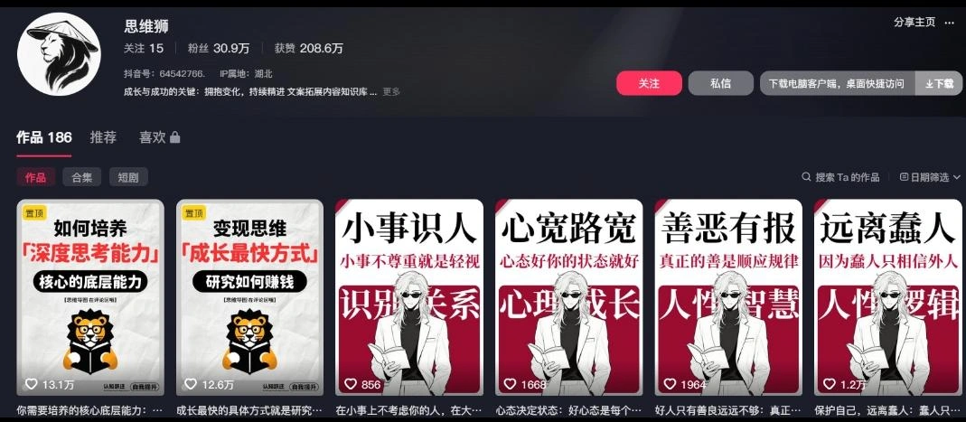 • 比如玄川最近发现的这个博主:186个作品,30.9万粉丝280.6万获赞。